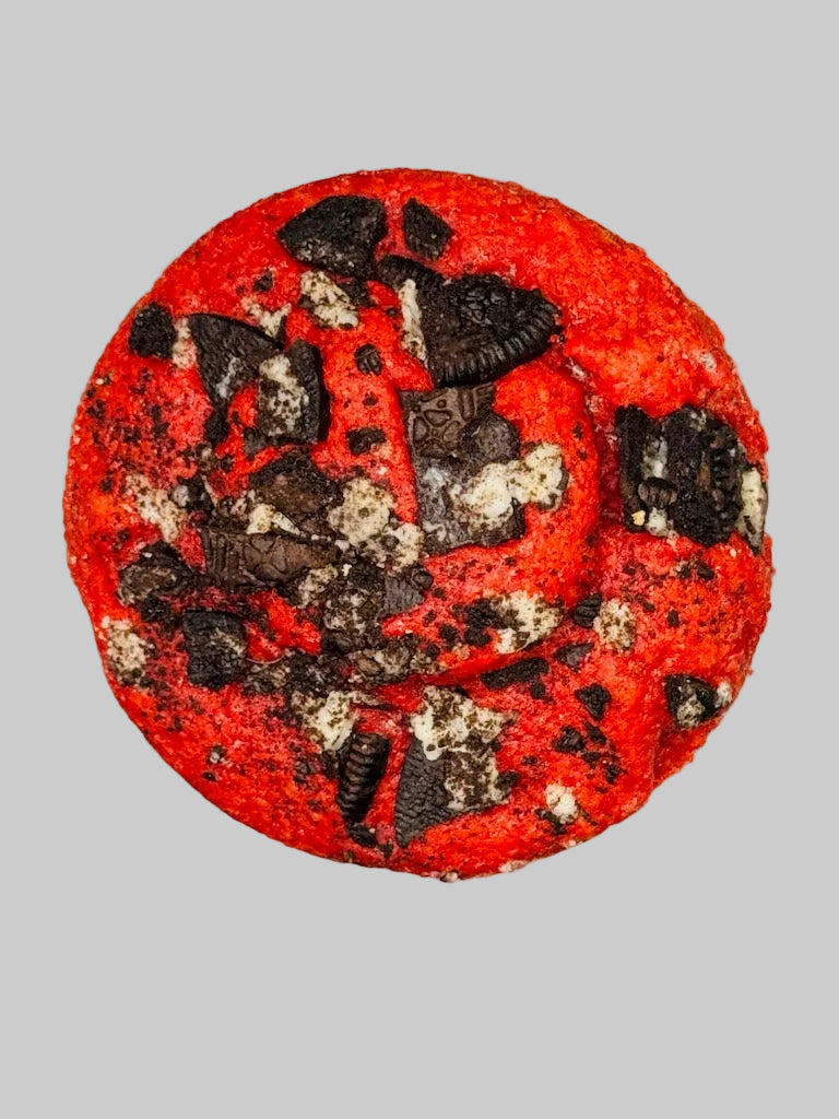 ❤️ Red Velvet Oreo: Our signature red velvet dough mixed with white chocolate chips, stuffed with a whole Oreo and finished with an Oreo crumble.